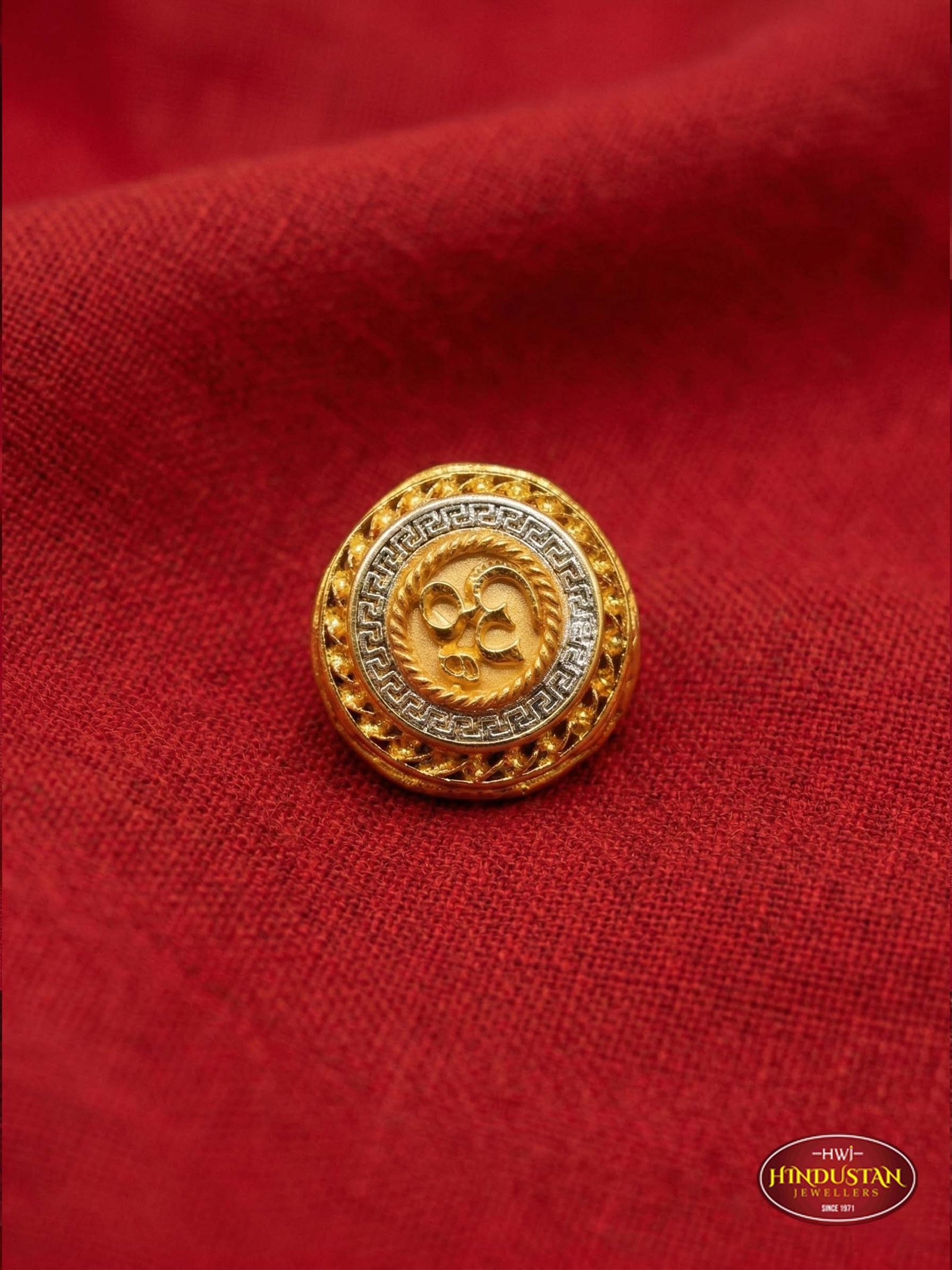 Dual-Tone Gold Sacred Om Devotional Ring with Greek Fretwork
